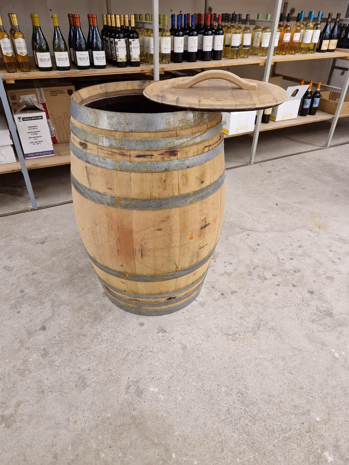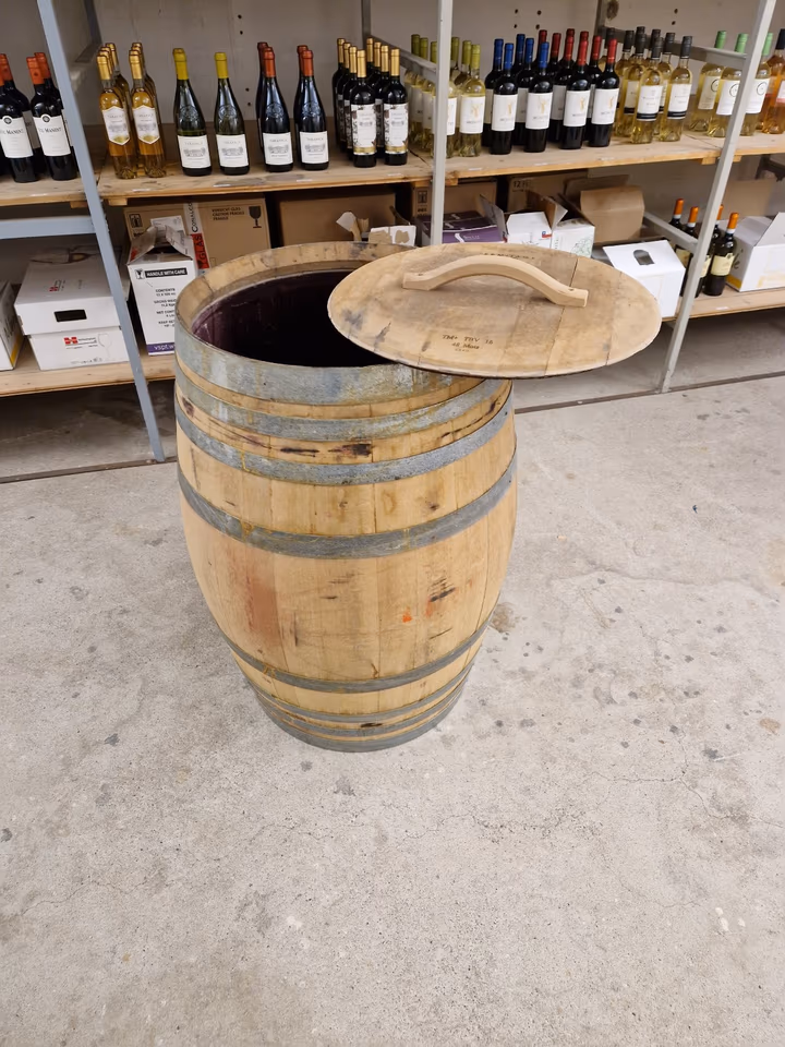 Rotwein belegt, ca. 4 - 6 Jahre alt. Fassringe verzinkt. Alle Fassringe