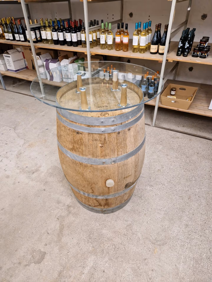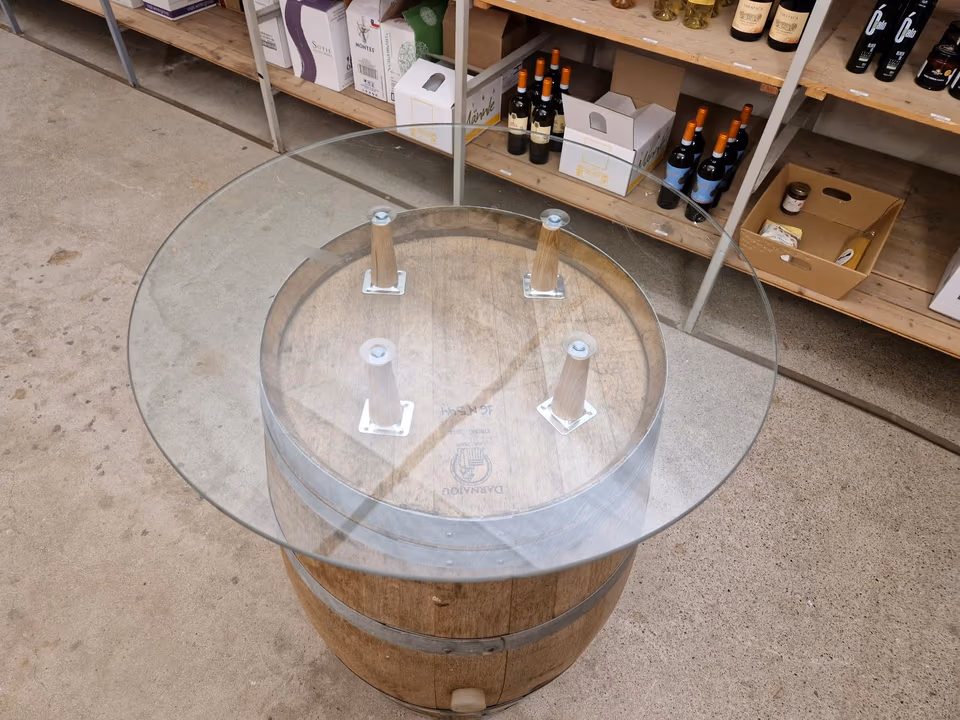 Wichtiger Hinweis: Dieser Artikel umfasst eine Tischplatte aus Glas und ein Weinfass mit Rotwein- und Gebrauchsspuren. Holz