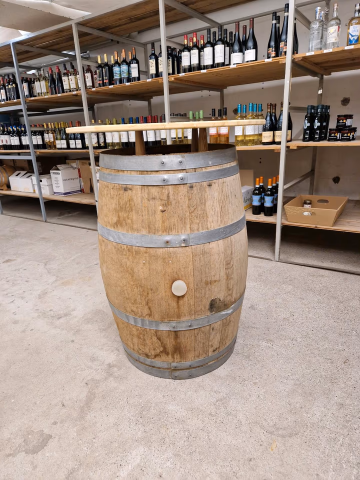 Produktinformationen "Gebrauchtes Barriquefass als Stehtisch, mit Holzplatte, 225L"