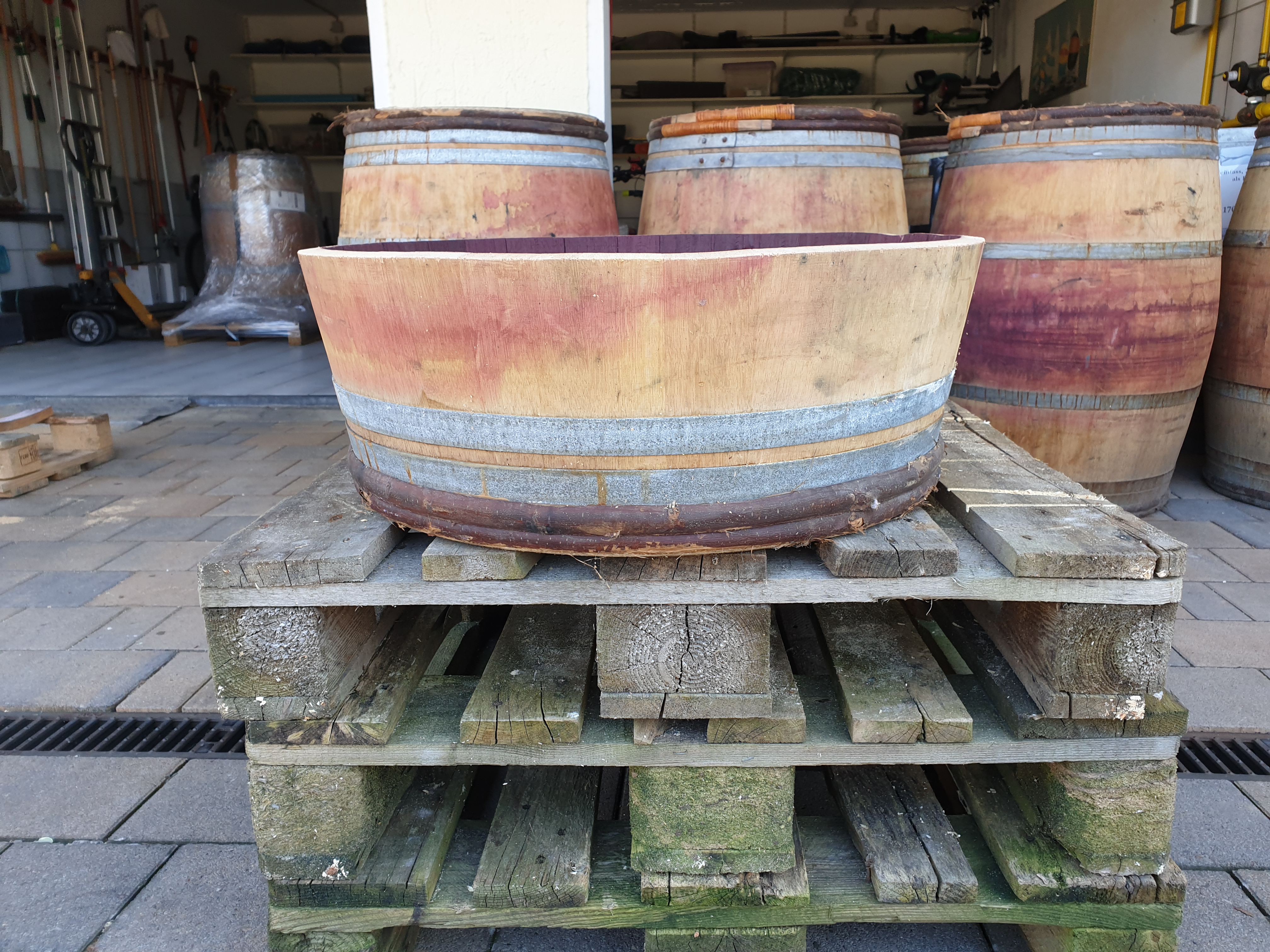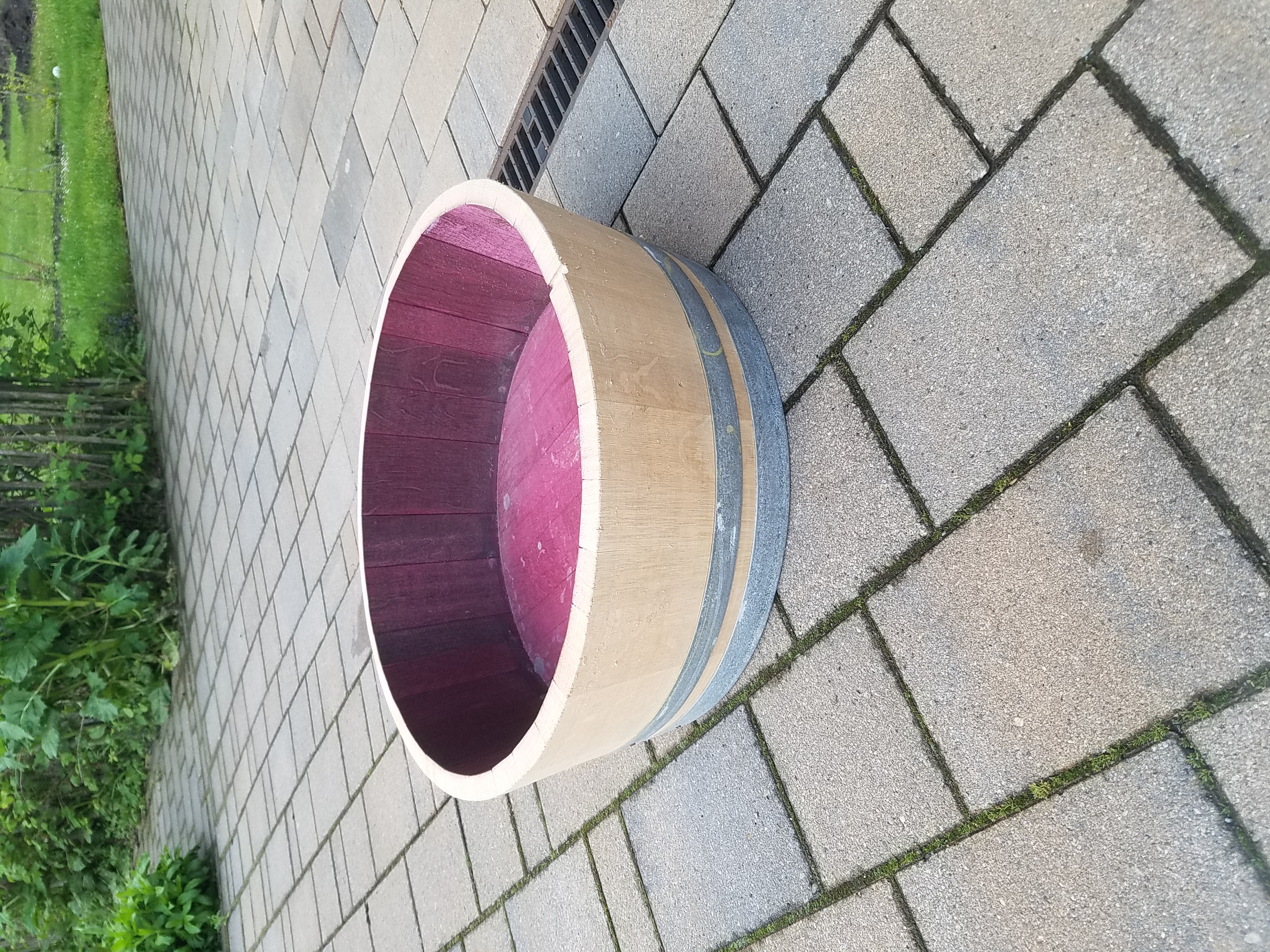 Gebrauchtes Weinfass, helles Holz, Rotweinspuren, Rotweinflecken um das Spundloch herum. Aus französischer Limousin-Eiche. Vorher mit Rotwein belegt, ca. 4 - 6 Jahre alt. Fassringe verzinkt. Alle Fassringe genagelt. Sie können diese viertel-Fässer als Miniteich, Pflanzkübel, Insektenhotel, Garten- oder Partykellerdekoration, oder als Vogeltränke nutzen. Holz ist ein Naturprodukt. Die Abbildungen der Produkte sind Beispielabbildungen. Farbgebung, Maserung, Ringanordnung, Ringart usw. kann vom Bild abweichen.